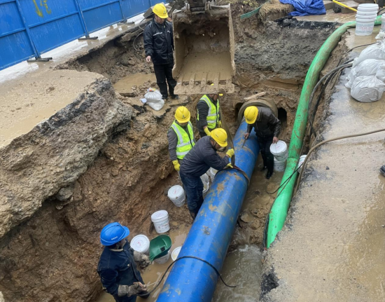 險(xiǎn)情就是命令,凌晨1點(diǎn),公司立即組織10余名搶修人員到場關(guān)閘止水。與此同時(shí),技術(shù)人員、施工人員和設(shè)備設(shè)施“跑步前進(jìn)”、同步到場,對破損溢水點(diǎn)進(jìn)行邊開挖、邊診斷。為加快搶修速度,減少對周邊用戶的影響,30余名搶修人員頂著嚴(yán)寒天氣連夜搶修。
