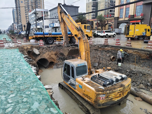 3 月 3 日下午三點二十五分,公司接到市民反映,孝武大道久尊酒店門口出現管網漏水情況。經調查,此次管網漏水,是由于道路施工開挖作業中存在違規操作。施工方致使供水管網暴露在外,卻未進行任何加固處理。作業坑道在大雨的持續沖刷下發生了滑坡現象。最終,在滑坡產生的強大外力作用下,該地段兩根DN400水泥管脫頭,進而引發了管網漏水問題。