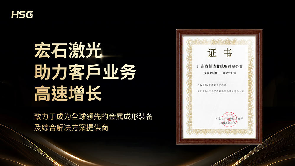 宏石激光自2006始創至今,已榮獲國家高新技術企業、國家知識產權優勢企業獎、行業創新大獎等多項國家和行業榮譽。此次獲評“廣東省制造業單項冠軍企業”,是對宏石激光堅實技術實力、良好產品品質與強勁市場競爭力的高度認可。宏石激光堅持以助力客戶業務高速增長為品牌使命,一直不遺余力地通過優質產品、先進服務等推動中國制造實現智能化轉型,致力于成為全球領先的金屬成形裝備及綜合解決方案提供商。