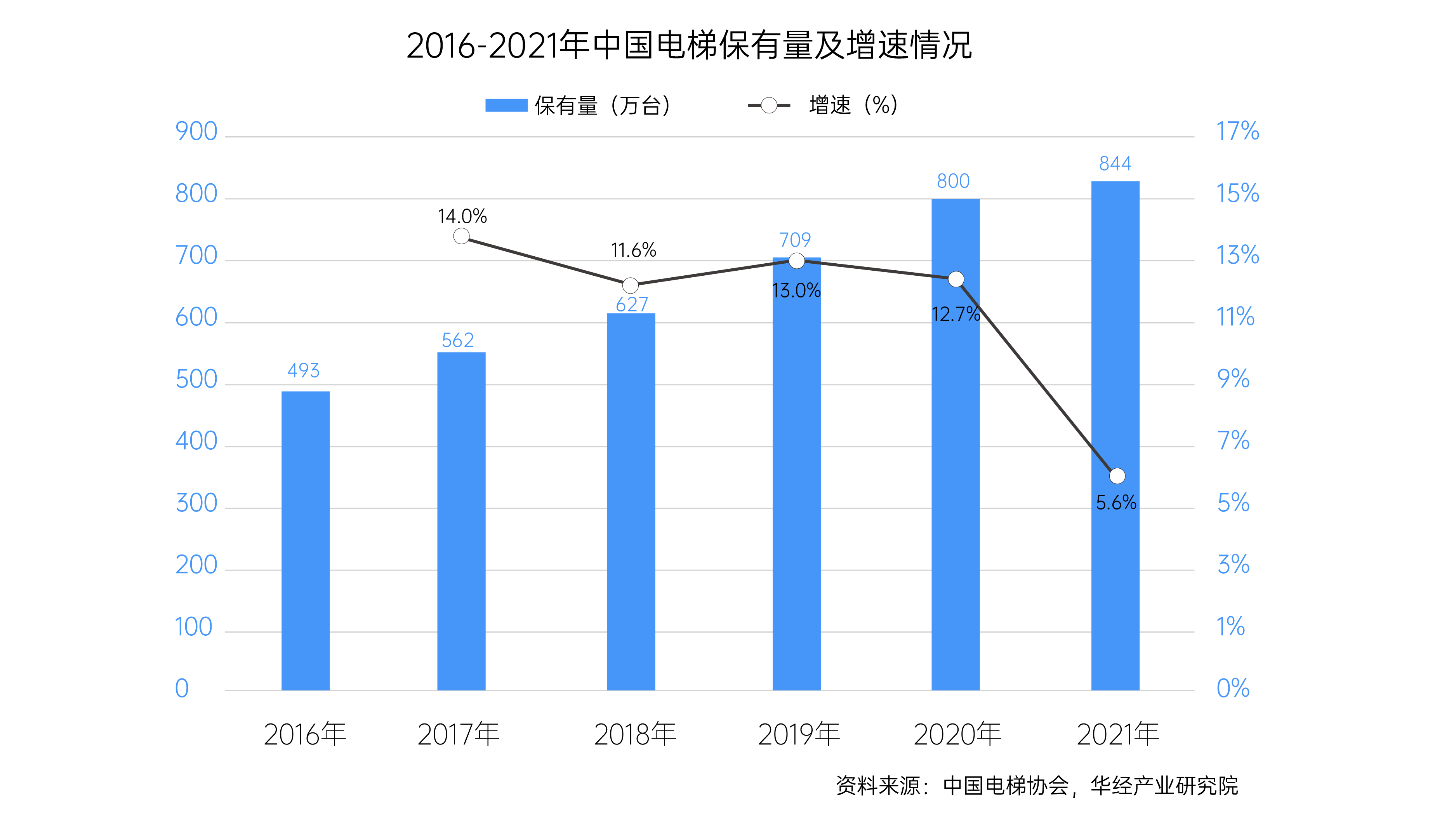 資料顯示,2021年我國電梯保有量為844萬臺,同比增長5.6%。在人口基數較大,人均電梯使用保有率提升,以及人口老齡化加重,老舊小區持續推進電梯新裝等背景下,我國電梯行業也迎來了增長的重要契機。